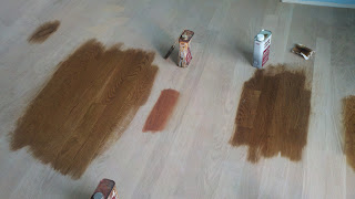 Now that the wood flooring has been installed, now is the time for staining! The flooring guys laid out a bunch of samples from Dura Seal.